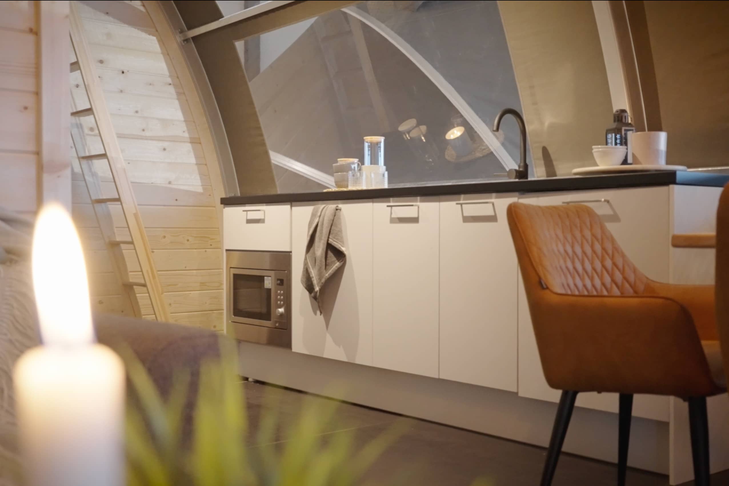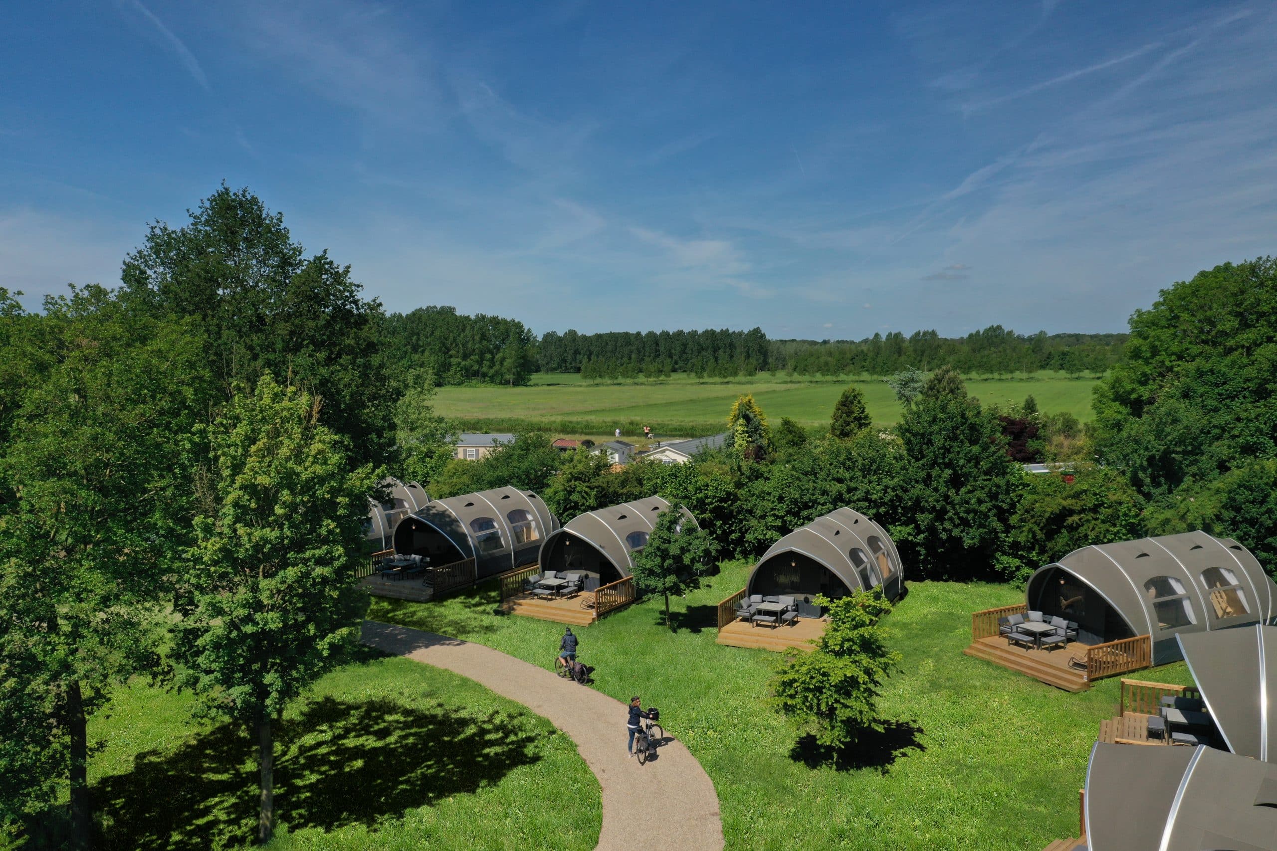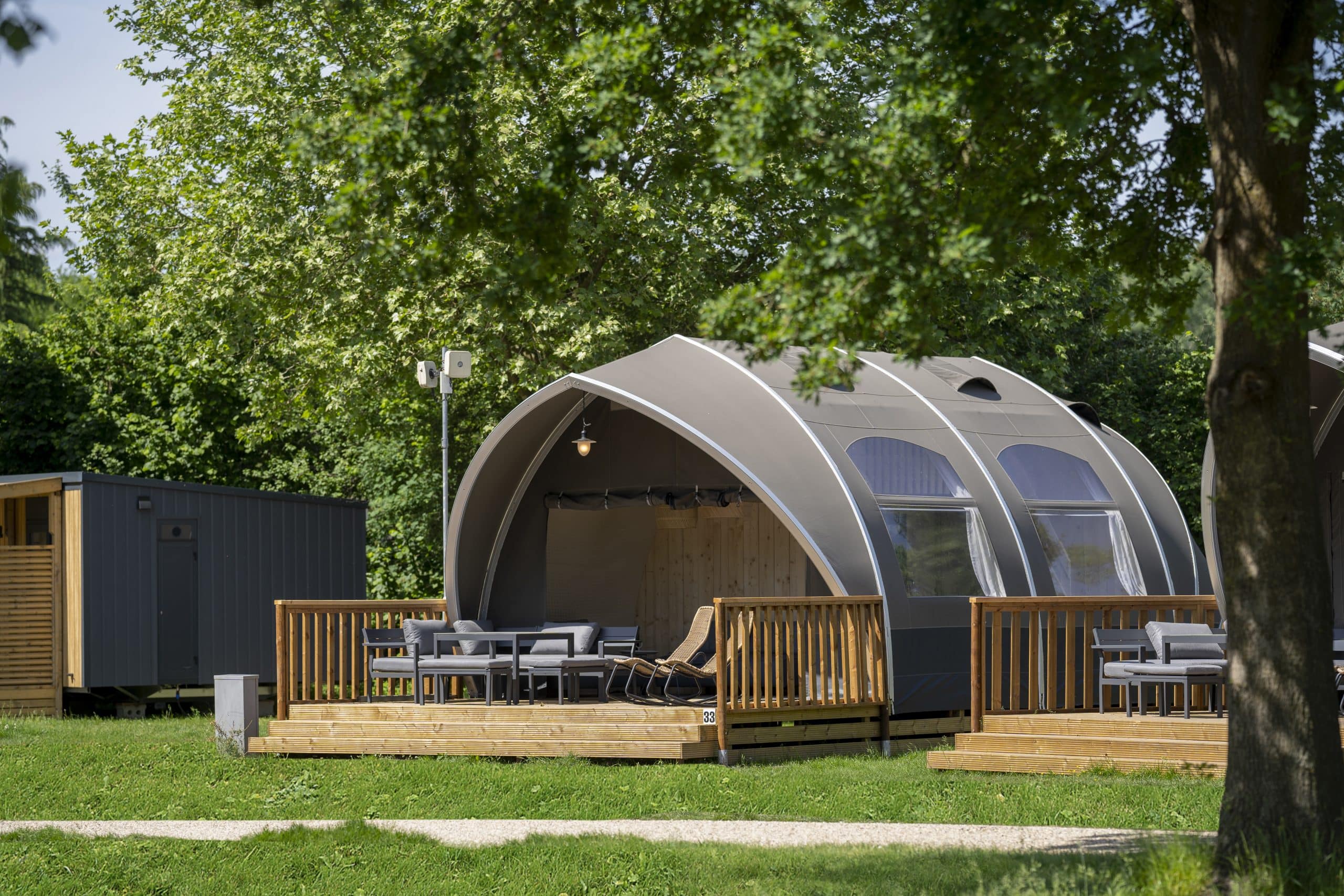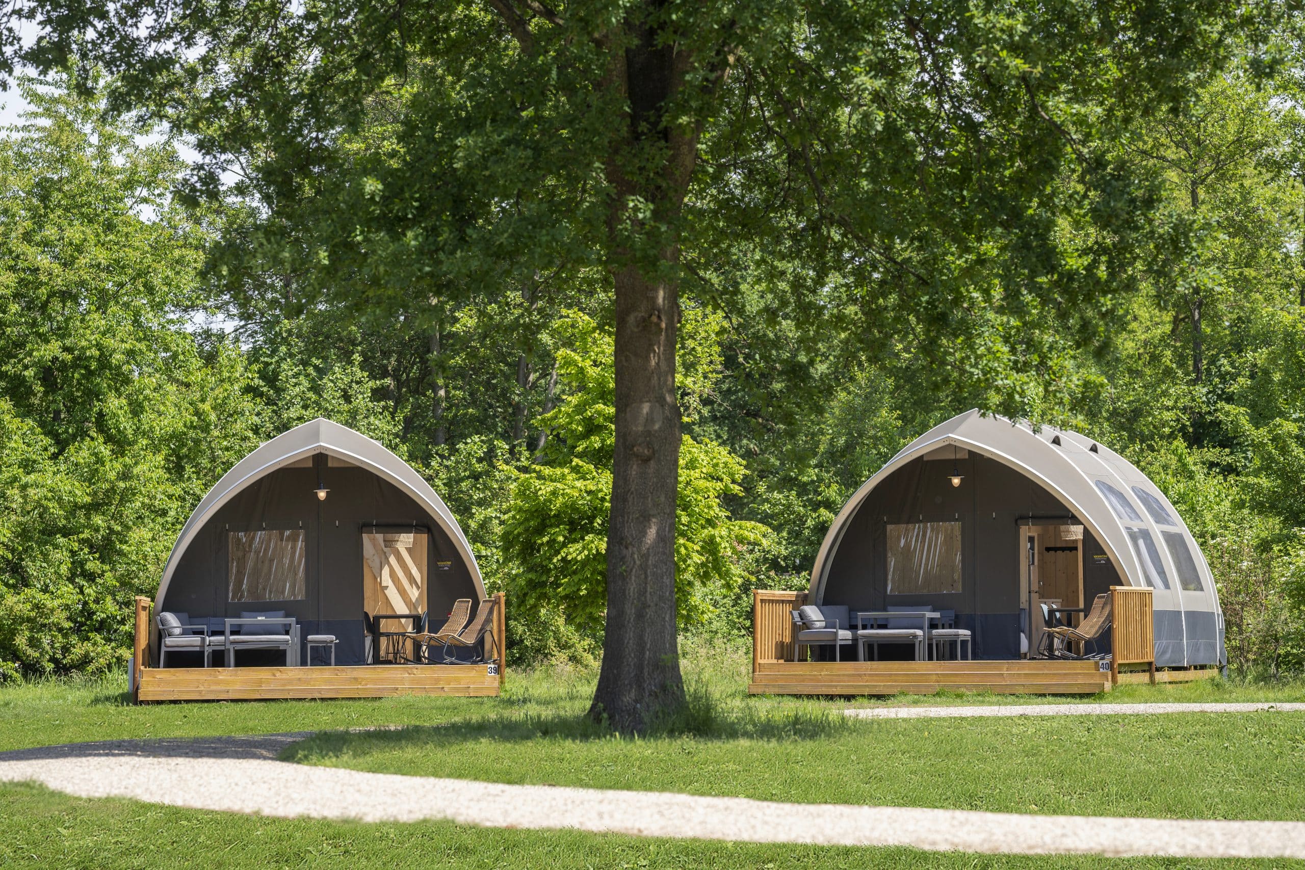 The Oak is one of our largest luxury tents and truly gives campers a sense of freedom and holiday in the middle of nature. This is especially due to the tent’s unique use of space: the wide entrance, large windows and 3.8-metre high ridge give guests that true camping feeling, but with the desired convenience and comfort, such as a high-quality bed, toilet, shower and kitchen.